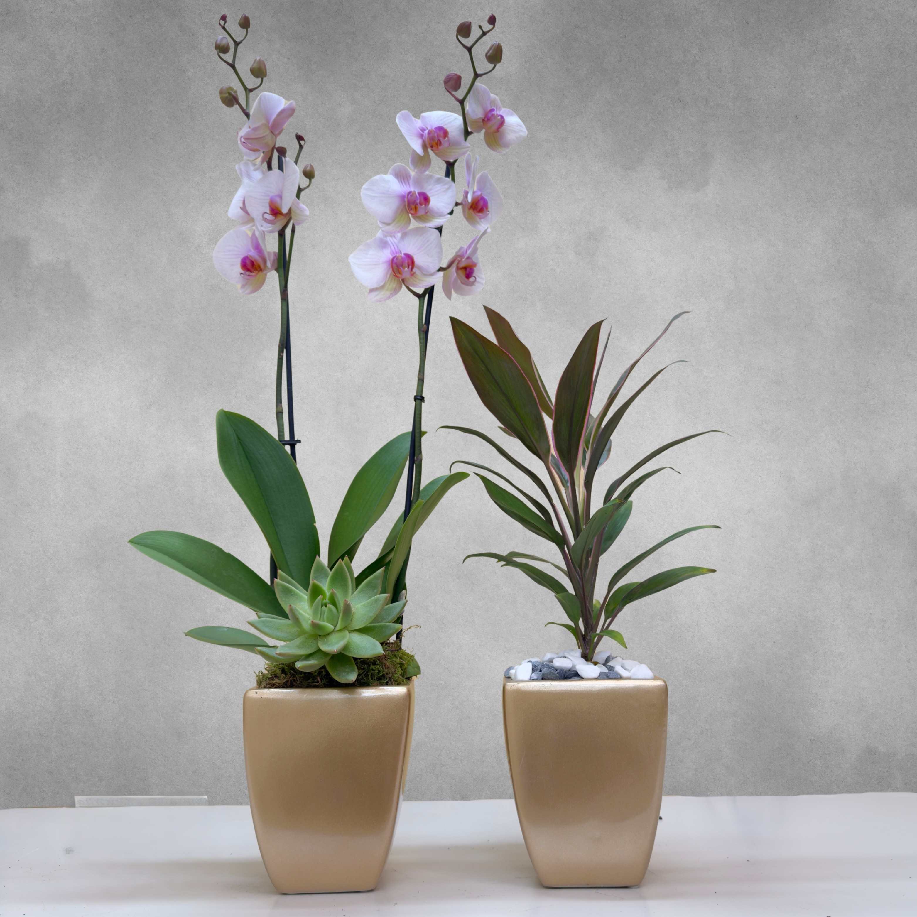 Nice orchid in a ceramic planter decorated with a succulent