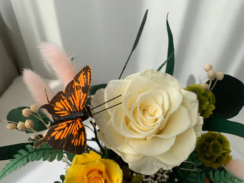 تنسيق راقٍ يضم مزيج من الورد الأبيض الحقيقي المحفوظ، مع خضرة خفيفة ولمسات أنيقة، داخل قبة زجاجية شفافة مع قاعدة سوداء عصرية.
